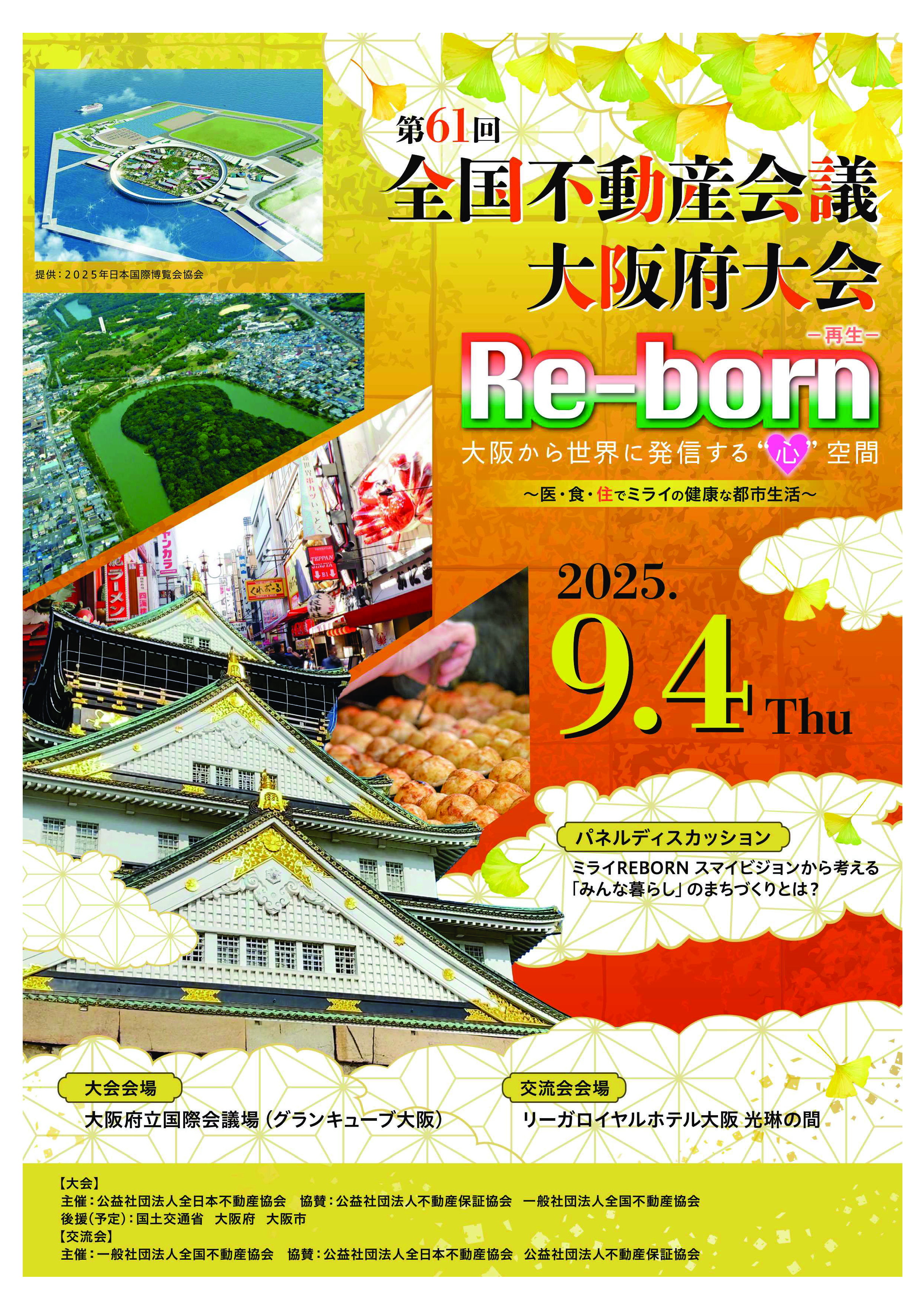 ABOUT大阪府大会のメインテーマは「Re-born-再生-大阪から世界に発信する"心"空間」として、サブテーマには「医・食・住でミライの健康な都市生活」を掲げております。このテーマには、変化し続ける社会の中で、私たちがより豊かで持続可能な都市空間を目指し、健康的な生活を提案する思いが込められております。講演内容につきましても、現在鋭意検討中ですので、皆様にとって有意義な時間になるよう、万全の準備を進めております。